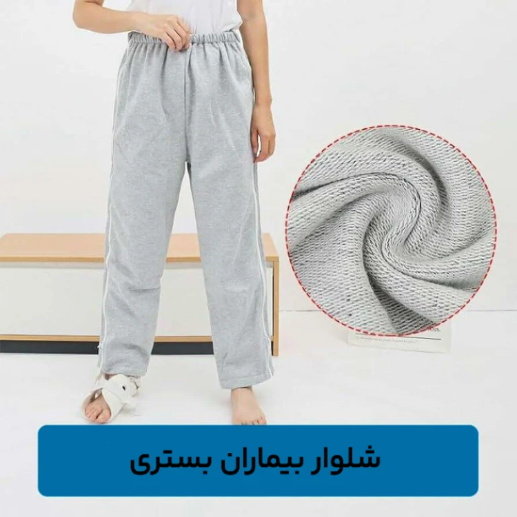 شلوار بیماران بستری از جنس پارچهای سبک و مقاوم تولید شده که به راحتی شسته شده و سریع خشک میشود.